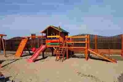 Złożony z: 2 huśtawek pojedynczych, Zjeżdżalni, Drabinki, Domku, Ścianki wspinaczkowej, Liny