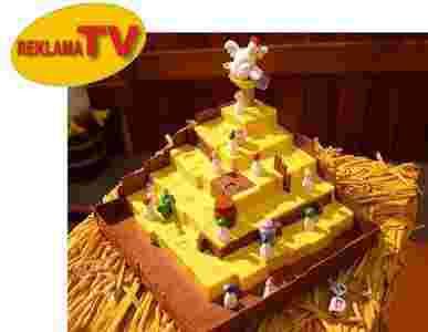 REKLAMA TV: od 20 listopada do 12 grudnia, 2011. Opis produktu: Gra, w której zamiast pionków występują kury, a na kostkach znajdują się obrazki przedstawiające nakrycia głowy. Gracz rzuca kostkami i przesuwa swoją kurę z odpowiednim nakryciem głowy o kolejne stopnie w górę. Musi być przy tym bardzo ostrożny, bo kogut potrafi rzucać jajkami. Wygrywa ten, kto jako pierwszy dotrze do gniazda koguta. Zwartość pudełka: 1 makieta do gry (stodoła z belami słomy), 1 gniazdo z kogutem i rynną, 1 bańka na mleko, 1 beczka, 1 wiadro, 1 polewaczka, 12 kur, 2 kostki, 1 jajko, instrukcja. Gra przeznaczona: dla 2 do 4 graczy, w wieku od 4 lat.