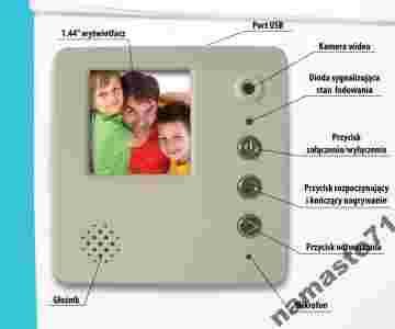 Video Pamięć posiada wbudowaną kamerę, mikrofon, kolorowy wyświetlacz 1,4”, głośnik oraz akumulator pozwalający na tydzień czuwania urządzenia.