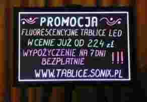 FLUORESCENCYJNE TABLICE LED są nowością na naszym rynku i działanie ich jest jeszcze mało znane. Dlatego firma SONIX wprowadza możliwość bezpłatnego wypożyczenia tablicy (tylko 40 x 60 cm) na okres 7 dni. Jedynym kosztem ponoszonym przez klienta jest koszt transportu z firmy i do firmy SONIX. W przypadku pozytywnej decyzji dotyczącej zakupu ten koszt transportu jest zwracany w pełnej wysokości. Klient ponosi opłatę za transport nowej tablicy jak w przypadku standardowego zamówienia.