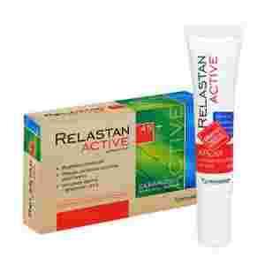 RELASTAN ACTIVE – KREM PRZECIWZMARSZCZKOWY POD OCZY przeznaczony co codziennej pielęgnacji skóry w okolicach oczu, zawierający m.in. olej ze słodkich migdałów, kolagen, kwas hialuronowy, ekstrakt z korzenia imbiru, panthenol oraz masła Shea. Krem wygładza zmarszczki, odżywia i nawilża skórę, rozjaśnia cienie pod oczami.