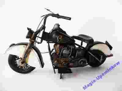Stylowy stary motocykl (replika) wykonany z metalu - przepięknie lakierowany, stylizowany na staroć (retro). Replika dysponuje ruchomymi kołami.