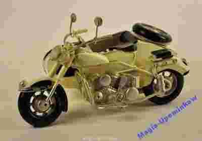 Stylowy stary motocykl (replika) wykonany z metalu - przepięknie lakierowany, stylizowany na staroć (retro). Replika dysponuje ruchomymi kołami.