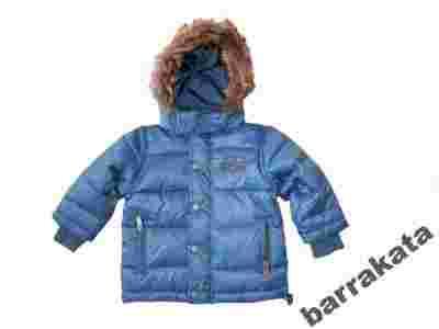 Kurtka zapinana centralnie ma suwak przykryty listwą z napami, przy szyjce stójka i na stałe doszyty ocieplany kaptur obszyty sztucznym futerkiem z dodatkowym zapięciem, kurtka pikowana w poprzeczne pasy ala puchówka, z przodu dwie kieszonki z zapięciem na suwaczki, długi rękaw z wewnętrznym dzianinowym ściągaczem, w dolnej linii od wewnątrz gumka ze stoperami, kurteczka na podszewce i warstwie ocieplenia, kolor: niebieska, idealna dla chłopczyka.