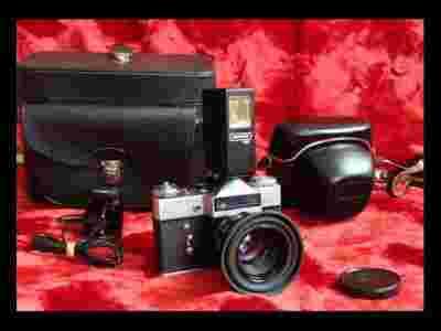 Przedmiotem sprzedaży jest wspaniały aparatu analogowy, kultowej marki: REVUE FLEX E Aparat posiada obiektyw HELIOS-44-2 , 2/58 i wbudowany światłomierz. Stan wizualny: Bardzo dobry. Idealny bez oznak używania. Stan techniczny: Aparat jest w pełni sprawny! Znajduje się w prost doskonałym stanie technicznym. Migawka, naciąg, wyzwalacz czasowy, a do tego płynnie obracające się pierścienie, przysłony, odległości i wszystkie pozostałe nastawy działają prawidłowo! Obiektyw aparatu - czysty jak ''łza'', bez najmniejszych rys, bez innych skaz. Wymiary: Wysokość kuferka: 19cm Szerokość: 26cm Głębokość: 16cm W komplecie znajduje się kuferek i wszystko to, co zostało przedstawione na zdjęciach: - Aparat fotograficzny REVUE FLEX Model: E - Lampa błyskowa z wbudowanym światłomierzem '' REPORTER 190 '' - Ładowarka do lampy błyskowej '' REPORTER'' - Przysłona - dekielek na obiektyw - Nakładka przeciw słoneczna na obiektyw (zdejmowana) - Oryginalny pokrowiec REVUE (kolor czarny) - Solidny usztywniany, skórzany kuferek