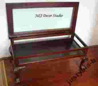 Przedmiotem aukcji jest cudowny stolik wykonany w całości z litego drzewa mahoniowego w kolorze ciemnobrązowym (ciemny kasztan delikatnie przechodzący w mahoń). Jest to stolik kawowy. Jest on bardzo solidnie i precyzyjnie wykonany. Szczególną uwagę przyciągają niezwykłe nogi stoliczka i szklany otwierany blat. Stolik jest nowy.