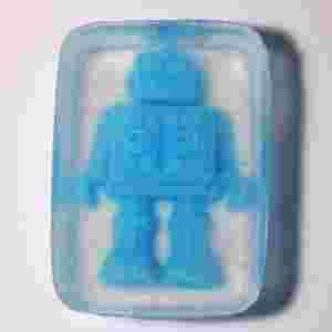 Mydlany robot zatopiony w przezroczystej kostce mydła glicerynowego