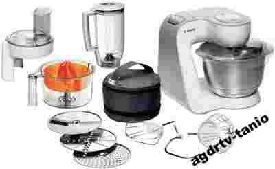 1 x Pokrywa, 1 x Rozdrabniacz do jarzyn (przelotowy), 1 x Miska do mieszania ze stali szlachetnej, 1 x Maszynka do mielenia miesa, 1 x Haki do zagniatania ciasta, metal, 1 x Dzbanek miksera z tworzywa sztucznego, 1 x Mieszadla do ucierania, 1 x Wyciskarka do owoców cytrusowych |