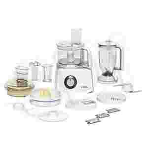 - Wyposażenie:Miska do mieszania z tw.sztucznego 500g, Dzbanek miksera z tworzywa sztucznego, Tarcza do ubijania, Popychacz, Nóz uniwersalny, Wyciskarka do owoców cytrusowych, wkłady tnące i szatkujące, Końcówka do wyrabiania ciasta, tarcza do frytek, sokowirówka
