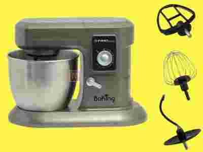 max.1200 W, wyposażony w 3 rodzaje metalowych mieszadeł do ugniatania, mieszania i ubijania, stalową misę o pojemności 6,5 l oraz 10 stopni regulacji obrotów.