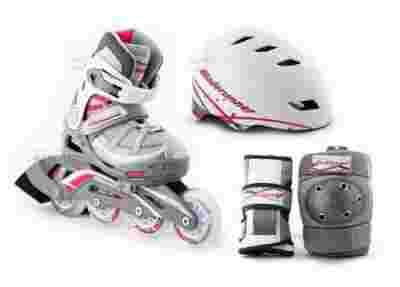 Regulowane rolki w zestawie z kaskiem oraz kompletem ochraniaczy na kolana i nadgarstki, zaprojektowane tak, aby jeszcze lepiej chronić Twoje dziecko.