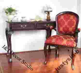 J&J Decor Studio zaprasza na aukcje! Przedmiotem aukcji jest śliczny zestaw składający się z biurka i krzesła. Meble z niezwykłymi zdobieniami wykonane są w całości z litego drzewa mahoniowego w kolorze ciemnobrązowym (ciemny kasztan delikatnie przechodzący w mahoń). Meble są bardzo solidnie i precyzyjnie wykonany. Główny ich atut to piękne, ręcznie wykonane zdobienia. Wszystkie oferowane meble są nowe.