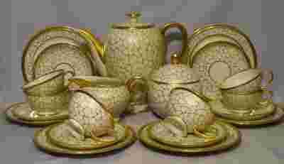 Porcelana wysokiej klasy. Kremowy kolor szkliwienia; efektownie wyprofilowana forma całości. Ręczne grube złocenia na obrzeżach, oprócz tego dekoracyjna złota siatka.