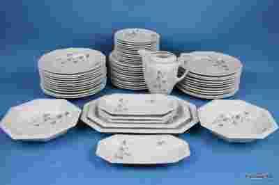 Przedmiotem aukcji jest serwis obiadowy na 12 osób sygnowany Rosenthal Selb Germany - model Maria, wzór polne dzwonki, sygnatura stosowana w latach 30-tych oraz 40-tych XX wieku. Model nazwany tak na cześć żony założyciela manufaktury Phillipa Rosenthala. Biała porcelana zdobiona jest fioletowymi kwiatkami oraz charakterystycznymi dla modelu tłoczeniami z owocami granatu na rantach.