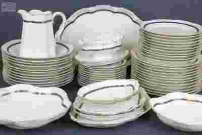 Serwis obiadowy sygnowany Rosenthal Bavaria - model Versailles, sygnatura stosowana w latach 1[zasłonięte]891-19 - I gatunek porcelany o czym świadczy numer kontrolera na naczyniach. Delikatna biała porcelana zdobiona jest złoceniami i delikatnym kobaltowo - złotym szlakiem. Ranty naczyń o nieregularnych kształtach, przepiękne reliefy sprawiają że serwis prezentuje się niezwykle elegancko.
