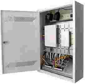 Na zdjęciu rozdzielnia z podłączonym do instalacji panelem R-TV-SAT i panelem internetowym. Podłączone anteny TV naziemnej i SAT oraz 8 gniazd abonenckich R-TV-SAT. Na 8 gniazdach RJ45 wykonano lokalną sieć internetową LAN, na pozostałych 4 instalacje telefoniczną. Dodatkowo zamontowany routerem ze switchem na 4 portyi twardy dysk ( własne IP) jako archiwum ftp ( zdjęcia, filmy back-up ) . W środku szafki pozostała wolna przestrzeńo wymiarach 300 x 300 x 70mm do montażu dodatkowych urządzeń.