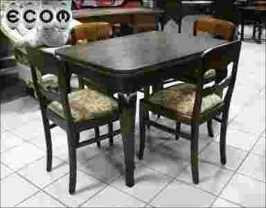 Rozkładany stół chippendale fornirowany dębem, wybarwiony na ciemny kolor. Dwa dodatkowe wysuwane blaty zwiększają rozmiar blatu do dwóch metrów. Nogi gięte, zgodnie z założeniami stylu. W kompecie cztery krzesła, siedziska na pasach oraz sprężynach. Dokonaliśmy renowacji stołu oraz stelaża krzeseł, tapicerka była w dobrym stanie, oczywiście możemy ją wymienić zgodnie z Państwa upodobaniami.