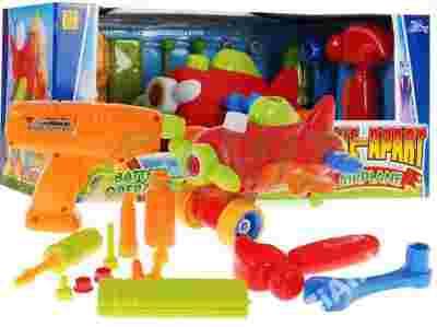 - 9 elementów narzędzi (takich jak wiertarka, młotek, nakrętki, śruby, wymienne końcówki do wiertarki),