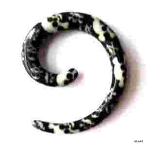 Przedmiotem sprzedaży jest rozpychacz spirala grubości 6mm, wykonana z akrylu, wzór CZARNA W BIAŁE CZASZKI. Grubość spirali 6mm, wysokość 35mm, szerokość 29mm.