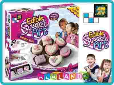 Sweet Art zabiera młodsze dzieci w bogaty świat zmysłów, którymi chłoną i poznają otaczający je świat. Bawiąc się, dzieci odkrywają rozmaite smaki, struktury, konsystencje i kolory, realizując jednocześnie swoje pomysły, pobudzając wyobraźnię. Dziecięce ręce w łatwy sposób ugniotą i wymodelują jadalną, słodką masę do pożądanego kształtu i formy. Z łatwością też będą posługiwały się zawartymi w zestawach narzędziami – wałeczkiem do rolowania, foremkami w różnych kształtach, czy zamykanymi formami do lodów na patyku. Do dyspozycji będą miały też akcesoria w postaci patyczków do lizaków, cukierkowych papierków, czy ozdobnego pudełeczka. Nie obędzie się też bez maszyny do robienia lodów w kubeczkach !