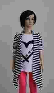 Śliczna biała bluzeczka z asymetryczną pasiastą narzutką. Bluzeczka jest połączona z narzutką, dzięki czemu nie będzie się dziecku zsuwała z ramion. Jest to idealne rozwiązanie na chłodniejsze letnie wieczory. Zamiast zakładać dwa ciuszki można je zastąpić jednym ubrankiem, które jest bardziej wygodne.