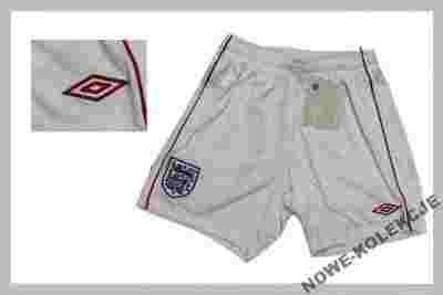 Opis: Nowe spodenki firmy Umbro. Biały, klasyczny kolor. Na lewej nogawce firmowa aplikacja.