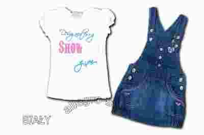 Jeansowa dziewczęca spódniczka ogrodniczka w komplecie z bluzeczką. Spódniczka "bombka" jest zapinana na guziczki i posiada dwie kieszonki. Całość jest fantazyjne zdobiona. Bluzeczka ma śliczne marszczone bufiaste rękawki oraz przepiękne zdobienia.