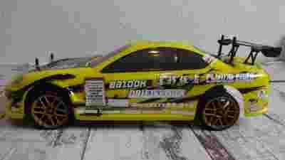 Model używany, stan określam jako dobry - widoczne na zdjęciach uszkodzenia nadwozia, wielokrotnie klejone, podklejane cyjano-akrylem/kropelką/- nie mające wpływu na właściwości jezdne. Pozostały elementy jak podwozie ,aparatura, koła, baterie noszą ślady normalnego użytkowania.Nadwozie /Body w skali 1:10 wymienne można dokupić.
