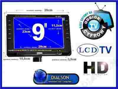 9 calowy przenośny telewizor z obsługą najnowszej telewizji DVB-T dostępnej w naszym kraju ( mpeg4 i w europie zachodniej mpeg2 ) Telewizor posiada dwa wbudowane głośniki,pilot zdalnego sterowania , antenę do odbioru tv , zasilacz sieciowy i samochodowy a także okablowanie i podstawkę