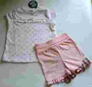 Przepiękna piżamka wykonana z bawełny najwyższej jakości. Bluzeczka z krótkim rękawkiem. Na białym tle różowe kropeczki. Po środku bluzeczki bardzo dziewczęca falbanka oraz szaro- srebrna kokardka. Spodenki w kolorze różowym na szerokim bawełnianym ściągaczu, co jest bardzo wygodne, zwłaszcza w przypadku mniejszych dzieci. Dzięki takiemu rozwiązaniu możemy być pewni , że nasze dziecko nic nie uwiera, a spodenki "rosną " razem z dzieckiem. Nogawki ozdobione falbanką oraz szaro-srebrną kokardką.