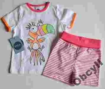 Prześliczna piżamka z bawełny najlepszego gatunku. Góra piżamki z krótkim rękawem. Na białym tle ciekawa aplikacja: zabawna, kolorowa papuga. Spodenki białe w różowe paseczki. W pasie szeroki bawełniany ściągacz, umożliwiający dopasowanie spodenek. Brak zewnętrznych szwów zapewnia wygodę. Piżamka sprawdzi się także jako komplecik na codzień.