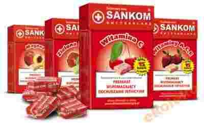 1-2 kostki do żucia, dwa razy dziennie (2-4 kostki dziennie). Po spożyciu kostki Sankom należy wypić przynajmniej jedną szklankę wody.