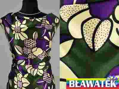 Satyna, kwiaty fiolet, krem, tło oliwka