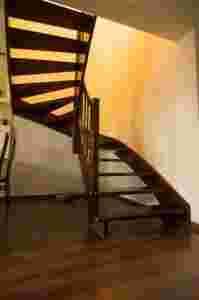 Przedstawione poniżej zdjęcia dotyczą schodów o konstrukcji samonośnej, wykonane z drewna bukowego bejcowanego. Schody dwuzabiegowe obustronnie wpuszczane w policzki, balustrady z wypełnieniem tralkami drewnianymi toczonymi.