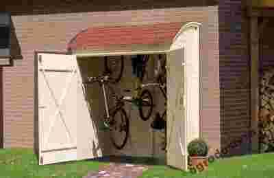 Drewniany schowek na rowery z drzwiami dwuskrzydłowymi i zaokrąglonym profilem.