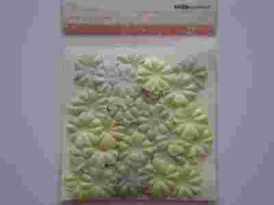 Przedmiotem aukcji jest komplet 50 papierowych kwiatków o średnicy ok. 2 cm, producent: Kaisercraft, oryginalne opakowanie, kwiatki są w dwóch odcieniach jasnej zieleni/limonki. Można barwić tuszami, mgiełkami itp.