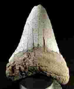 Ząb prehistorycznego, olbrzymiego rekina - Carcharodon megalodon - Agassiz, 1843 z polskiej lokalizacji. Pochodzenie: trzeciorzęd- miocen- baden (ok. 16,4mln lat), obrzeżenie Gór Świętokrzyskich (dokładna lokalizacja dla zwycięzcy aukcji). Wymiary: wysokość całkowita- 77mm, szerokość całkowita- 62,6mm, waga- 60,3g. Znaleziska zębów Megalodonów w Polsce należą do wielkich rzadkości. Na prezentowanym okazie widoczne są ślady drążeń nieznanych organizmów.