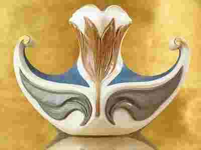 Wyrób porcelanowy o malowniczym,niezwykłym fasonie.Całość zdobiona wypukłym,wyczuwalnym reliefem roślinnym o płynnej linii.Motyw zdobniczy wielobarwny.Obrzeże nieregularne-podkreślone satynowym złotem.
