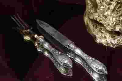 Drodzy Państwo jest mi niezmiernie miło móc zaoferować tak wspaniałe miniaturki w postaci pięknego nożyka i widelca. Miniaturki zostały wykonane ok. 1900 roku w przepięknym stylu z secesyjnymi motywami na obydwu uchwytach. Całość wykonano ze srebra 800 - próba bita. Widelczyk dodatkowo został pozłocony. Dla kolekcjonerów i miłośników tych wyrobów nie muszę nic więcej nadmieniać, jest to niewątpliwie rarytas jakie rzadko występują na Allegro. Tak wspaniałe wyroby i w tak świetnym stanie są bardzo dobrą lokatą kapitału zwłaszcza, że można je używać także na co dzień.
