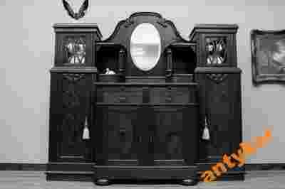 Z niezmiernie dużą przyjemnością zapraszamy Państwa na prezentację eleganckiego i wytwornego kredensu. Jest to nadzwyczaj piękny i niepowtarzalny mebel, składający się z dwóch części. Wykonany został na przełomie XIX i XX wieku z drewna dębowego częściowo fornirowany dębem, utrzymany w bardzo atrakcyjnym, ciemnym odcieniu brązu.