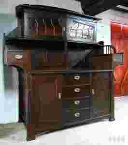 Piękny, rzadko spotykany kredens dębowy. Rozłożysta górna część, całość w stylu secesyjnym. W dolnej części z lewej strony oraz za drzwiczkami nadstawki są półki, nie ma ich tylko na zdjęciach. Poprzedni właściciel dostawił poprzeczkę między blatem a górną witryną, najwidoczniej trzymał 'ciężkie' rzeczy w tej witrynce. Poprzeczkę również poddaliśmy zabiegom renowacyjnym, jednak jeżeli nie pasuje ona Państwu do bryły mebla można ją bez problemu zdemontować.