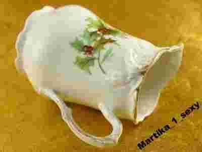 Mlecznik wykonany z doskonałej jakości porcelany białej,zdobiony ślicznym,roślinnym motywem w cudnej kolorystyce.Dodatkowo przedmiot wzbogacono bogatym,wypukłym reliefem i pięknie wymodelowanym uszkiem.Całość bardzo ładnie wykonana co sprawia,że artykuł prezentuje się zachwycająco.