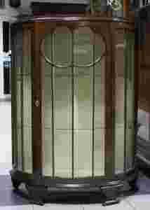 Orzechowa serwantka w stylu Art deco. Szyby zdobione pionowymi szprosami, w środku dwie szklane półki.