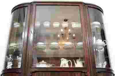Za otwieranym skrzydłem obszerne, czyste i zadbane wnętrze - bogate w szklane półki, co sprawia, że prezentowana tu porcelana wygląda naprawdę najpiękniej.