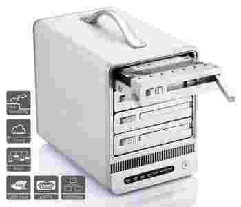 Urządzenie obsługuje do czterech dysków twardych 3.5" SATA (do 4TB każdy) w konfiguracjach JBOD, RAID 0/1, Raid 5/6, Raid 10 z opcją szyfrowania wolumenów algorytmem AES. Dyski instalowane są w oddzielnych, łatwo dostępnych kieszeniach z obsługą hot-swap.