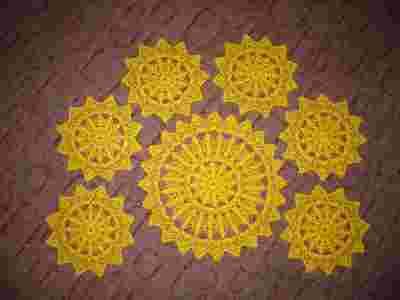 Witam na mojej aukcji Przedmiotem aukcji jest komplet szydełkowych serwetek w kolorze żółtym o średnicy: większa 32 cm + 6 mniejszych po 20 cm - rękodzieło. Sąpięknie wykrochmalone i naciągnięte. Serwetki szczególnie nadają się na ozdobę stołu lub prezent - za niewielką cenę możesz mieć niepowtarzalny, oryginalny upominek. Prezentują się efektownie w każdym wnętrzu – stwarzają atmosferę przytulności i ciepła. Są trwałe i przez lata wyglądają tak samo, a odpowiednio konserwowane mogą służyć jeszcze Twoim dzieciom i wnukom. Chętnie odpowiem na pytania i zapraszam do wyboru innych moich prac.