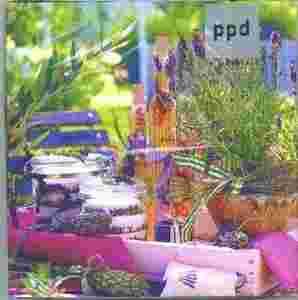 Papierowe serwetki w zielono- fioletowej kolorystyce z realistycznym rysunkiem lawendy. Producentem jest niemiecka firma PPD (Paperproducts Design). Serwetki są trójwarstwowe po rozłożeniu mają wymiar 33 cm x 33 cm.