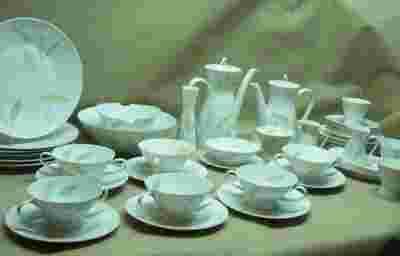 Serwis kawowy i obiadowy na 6 osób niemieckiej manufaktury Rosenthal Selb Bavaria. Zestaw wykonany z białej porcelany, zdobiony motywem liści w pastelowych kolorach. Stan bardzo dobry. Skład zestawu (47 części):