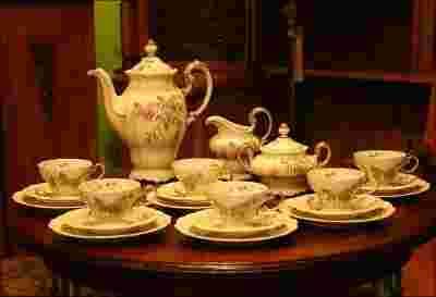 Bawarski zestaw kawowy dla sześciu osób Rosenthal z serii Pompadour. Jest wiele zestawów Pompadour - ten zdecydowanie można zaliczyć do tych większych. Różni się zdecydowanie wymiarami od innych, które również mamy w ofercie. Zestaw w kolorze ecru ze złotymi dodatkami i delikatnymi zdobieniami w pastelowych odcieniach zieleni i bladobordowymi akcentami kwiatów ('kotków') topoli. Przepraszamy za zdjęcia całego zestawu. Odbiegają od naturalnego koloru, który całe szczęście jest bliższy prawdy na zdjęciach pojedynczych elementów. W skład wchodzi: 6 filiżanek, 6 spodków, 6 talerzy, dzbanek, mlecznik oraz cukiernica. Stan: bardzo dobry / idealny (jak na zdjęciach) WYMIARY: Dzbanek wysokość 29cm szerokość 27cm Cukiernica wysokość 15cm szerokość 19cm Mlecznik wysokość 14,5cm szerokość 14,5cm Filiżanka wysokość 6,5cm średnica 9,5cm Spodek średnica 15,5cm Talerz średnica 19,5cm