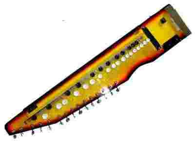 This great contemporary design shahi baaja combines the best of the Electric Bulbul Tarang, the Hawaiian Steel (Lap) Guitar and the Swarmandal (Indian harp). It belongs to the Tat Vadya family of plucked string instruments. The primary design of this instrument is inspired by the famous medieval Japanese Taishokoto. However this one has three instruments rolled into one and given an electric tweak. The keyboard dulcimer part of this instrument (remember this unit is several instruments rolled into one) is referred to as the bulbul tarang (literally translates to "waves of nightingales") or the Indian banjo but this has nothing to do with the Western bluegrass banjo - perhaps just a fuzzing of the words banjo with baajo (literally, "instrument")